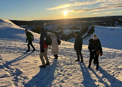 Seks personer som går ute i snøen, med blå himmel og lav sol i bakgrunnen. - Klikk for stort bildeEksotisk besøk til verdensarvbyen Røros NØVGS