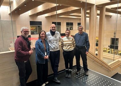 Fire smilende personer som står oppstilt øverst i en trapp  på skolen. - Klikk for stort bildeRepresentanter fra NØVGS sammen med gjestene fra Malta NØVGS