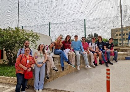 Elever og lærere står eller sitter på en mur utenfor skolen. - Klikk for stort bildeElever og lærere fra 3MUS utenfor G.F. Abela Junior College NØVGS