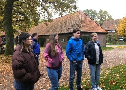 Fem elever som står utendørs i høstvær og får informasjon om gården de besøker. - Klikk for stort bildeElever fra NØVGS på Hof Tütsberg i Soltau. NØVGS