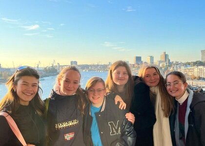 Seks blide elever som står oppstilt med elva og byen i bakgrunnen. - Klikk for stort bildeElever fra NØVGS og vertselever fra Soltau i Hamburg. NØVGS